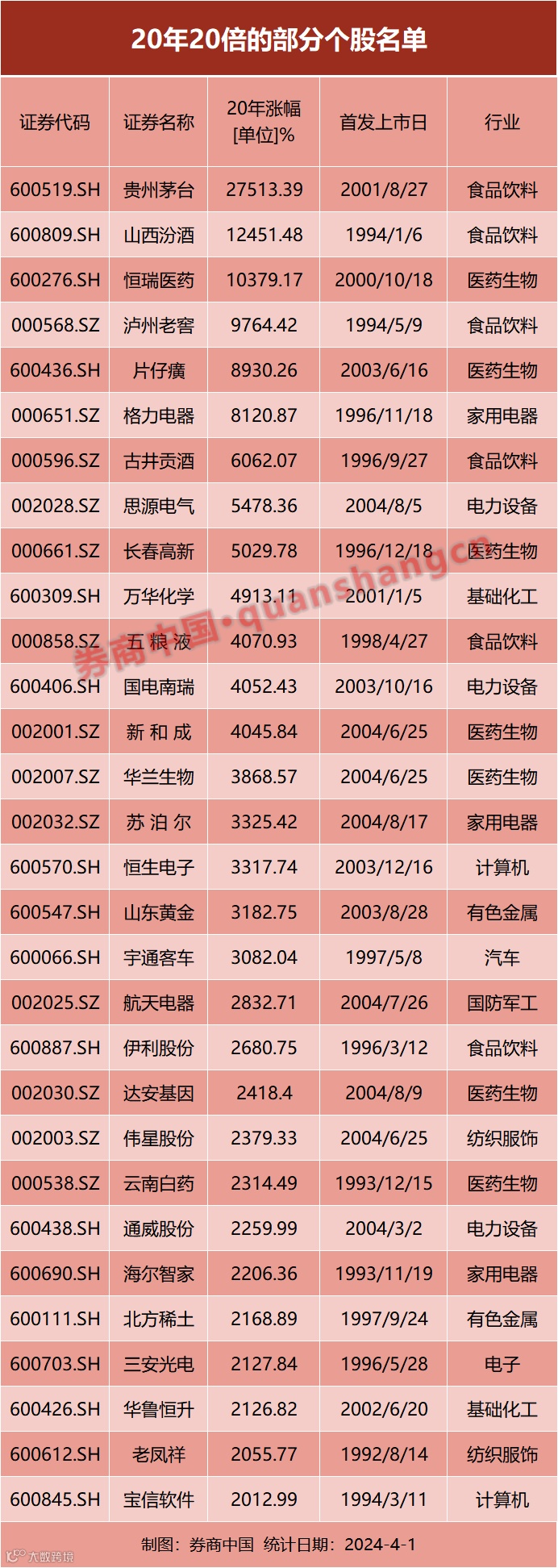 A股同样存在长期带给投资者巨额收益的公司。统计数据显示,在过去20年的时间里,涨幅超过20倍的个股63只,它们为投资者创造的年化收益超过16.4%,跑赢了几乎所有的基金产品。其中,贵州茅台、山西汾酒和恒瑞医药更是涨幅超过100倍,年化收益超过25%。