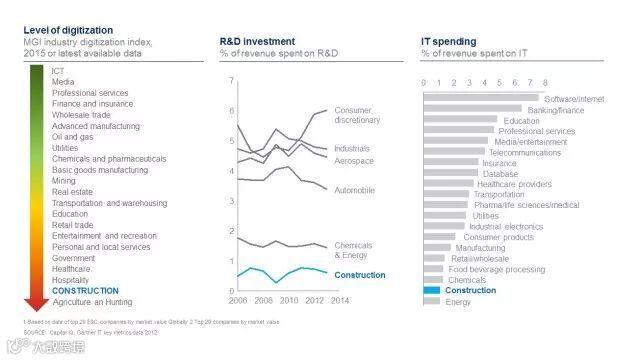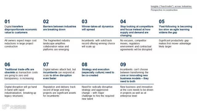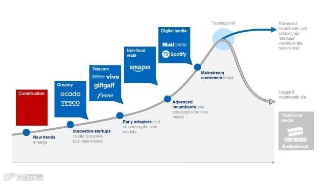 这对我们来说意味着什么?我们做了分析,这同时也是我们作为咨询集团的益处,我们可以考察各个行业。在数字化时代的洪流之中,建筑业处于落后的位置,这时我们就可以参考其他行业在数字化进程中的经验。例如,数字化媒体,这可能是第一个受数字化冲击的行业。然后延这个曲线看下去是零售业、通信业、在这些行业不断涌现了一些技术革新型企业。