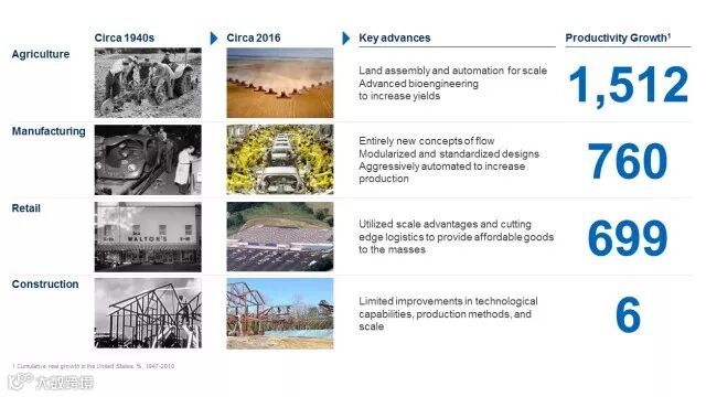 追溯全球发展进程,建筑业曾是技术创新的领导者。几个世纪以前,许多创新发生于建筑业。比如帝国大厦,它在当时的建设是超前的。放眼现在,通过一些数据我们不难发现,建筑业已经远远地落后于其他行业。生产力增长落后,几乎为零。如果我们对比其他三大领域——现代农业、制造业、零售业,这些行业的过去与现在已经发生了翻天巨变, 但是如果你对比几年前的建筑现场以及今天的建筑现场,你很难发现任何变化。