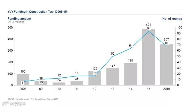 让我们一起来看看建筑技术的投资情况。如表格显示,过去九年我们一直都在研究建筑数字化领域和建筑技术的投资情况。据不完全统计,我们可以看到资金从2012年开始持续增长,2015年突破性地达到了5亿,我们认为未来还会继续增长,并且会有更多的投入进建筑数字化技术。这是一个飞跃的发展。风平浪静一个世纪后,此刻,你将见证如滔滔江水般的资金流融入建筑技术领域。