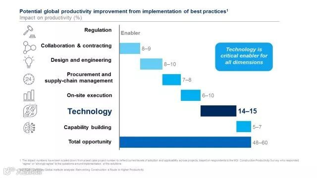 我们对建筑业的发展做了追溯和分析,去年iTWO World 2016峰会上,我给大家展示了一个数据——建筑业生产力与制造业生产力之间的差距达50%,而这个差距从20年前至今没有缩小过。所以我们再一次做了追溯和分析,如果把所有能想象的原因放在一起研究,又会得到什么结论呢?要想得出每种原因的影响百分比并非易事,但如果我从表格最底下的数据看起:推动建筑生产力提升的进步空间共达50%-60%,这是一个很大的机会!接着我们把每一个因素拆分,无论是承包合作、设计规划、供应链管理、施工执行因素,或是影响建筑行业最关键的技术因素,还是把建筑业与其他行业区分开来的综合实力建设因素,只要你把这些因素一个个攻破,那么差距一定越来越小。因此,我认为推动建筑领域生产力革命的手段有两个,一是我们目前已掌握且需加强运用的创新技术,另一个可归纳为剩下其他皆与技术紧密相连的因素,所以我们可以很肯定地说技术革新是推动建筑生产力巨变的核心力量。
