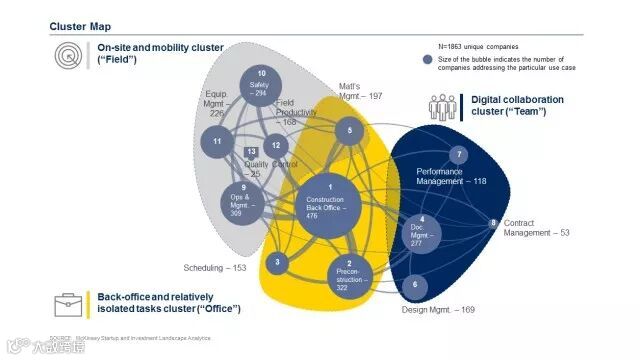 我们分析了一下现有的解决方案所应对的技术领域。图标中蓝色圈圈的大小表示某个技术领域获得投资的公司的数量。我们把所有解决方案分为三个技术发展领域。一个是施工现场:现场施工,所有物料、机械管理等。黄色这个技术领域是后勤办公室,关于计划、设计等工作。然后深蓝色这一块是协同合作,协作让复杂的环境中的事情变得更容易。我们把这些众多的解决方案分为大三领域,让大家更好地理解我们面临的复杂的市场环境。