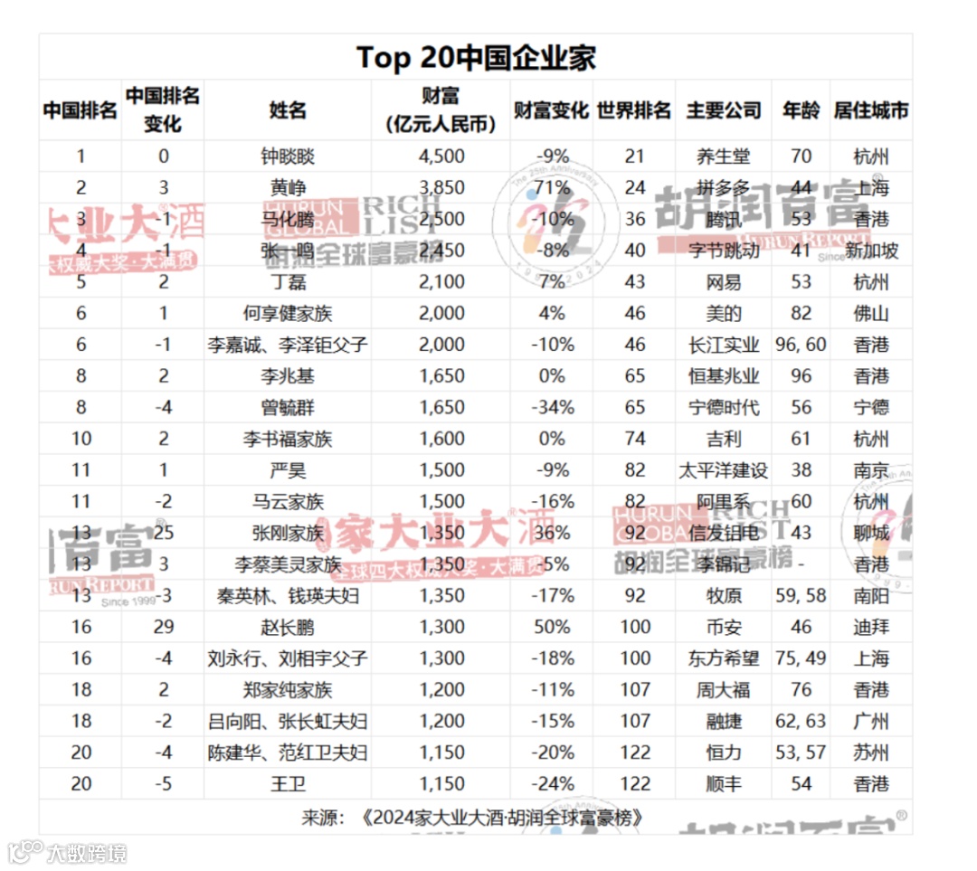 马化腾财富比去年下降10%,以2500亿元位列中国第三。张一鸣财富下降8%,以2450亿元位列中国第四。丁磊财富增长7%,以2100亿元位列中国第五。何享健及其家族财富增长4%,以2000亿元位列中国第六。李嘉诚、李泽钜父子财富下降10%,以2000亿元位列中国第六。李兆基财富保持1650亿元,位列中国第八。曾毓群财富比去年下降34%,以1650亿元位列中国第八。李书福财富与去年持平,以1600亿元位列中国第十,上升2位。