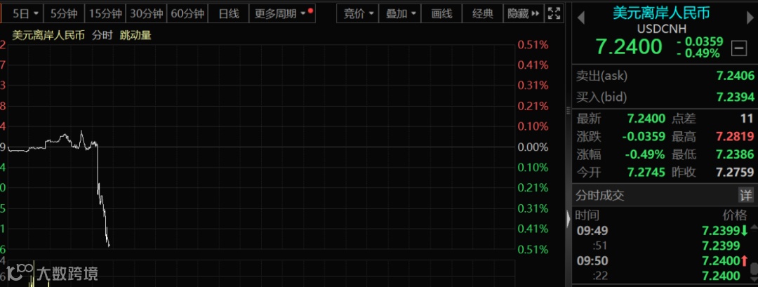 就在刚才,离岸人民币兑美元狂拉超350点,日元也开始拉升,美元指数出现杀跌,北上资金早盘亦呈净买入状态。那么,究竟发生了什么?