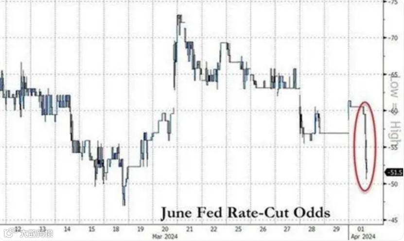 美股科技股集体重挫的另一个原因是,美联储降息预期突然遭到打压。在美国ISM制造业活动指标意外扩张后,交易员对美联储今年货币政策宽松的预期大幅降温,今年6月首次降息的概率已跌破50%。