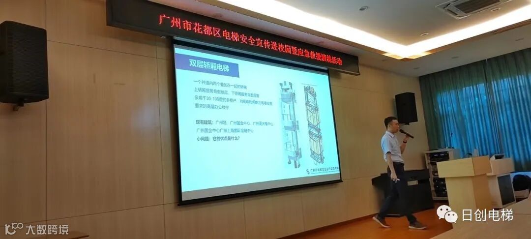 “在广州也有技术含量较高的双层轿厢电梯....”广州机电院高级工程师叶亮向同学们介绍许多不同的电梯知识,加深同学们对电梯的认识。