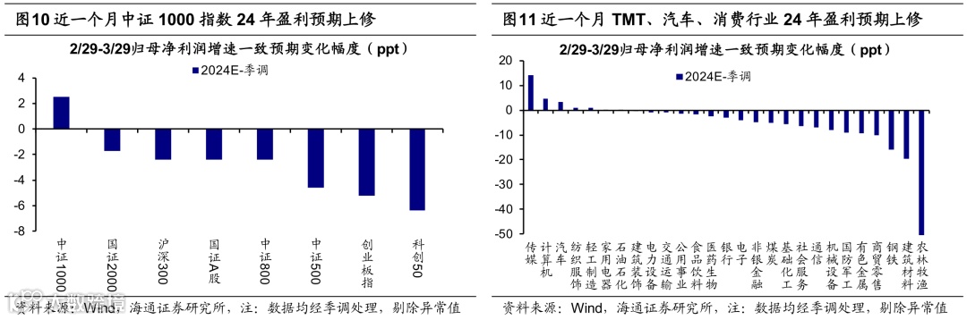 维度3:从盈利一致预期看,TMT、汽车以及消费行业业绩预期边际上修。分析师一致预期是基于专业分析师对公司业绩的调研和分析得出的结果,这些预期蕴含了各种信息,具备一定的准确性和领先性。因此,我们或可以通过观察近期业绩预期的变化,发掘正在被定价的积极因素,继而探知上市公司一季报的情况。下文主要采用通联一致预期数据作为分析对象,所有数据均经过季调处理。