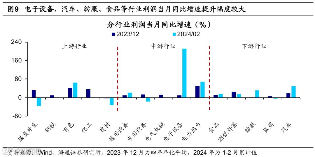 具体行业看,1—2月电子、汽车等装备制造,纺服、食品等消费增速较快。取四年年化平均增速后,我们发现上游行业中,除有色增速回升,其他行业利润均在边际回落,其中煤炭增速由正转负;中游行业中,电子设备、电力热力和通用设备行业利润边际改善,其中电子设备利润改善最为明显,从去年12月的10.2%升至210.9%;下游行业中,汽车、纺服、食品利润增速均在回升,其中汽车利润改善最为明显。