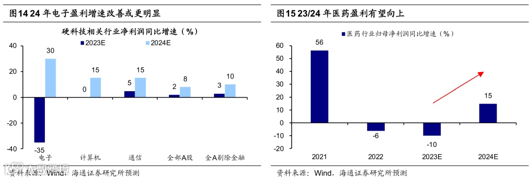 分具体行业看,分析师主要上修TMT、汽车、部分消费行业的业绩预期。具体而言,近一个月以来,传媒、计算机行业的业绩上修幅度最明显,上修幅度分别达14.1个百分点、4.8个百分点,反映到现实是以Sora为代表的AI技术、发展新质生产力的政策定调等积极因素正持续被定价;汽车行业业绩预期也出现上修,上调幅度为3.4个百分点,说明近期汽车供需双强的格局也已在被定价;此外,纺服、轻工、家电等行业的盈利一致预期也边际上调,变化幅度分别达1.0个百分点、1.0个百分点、0.1个百分点,显示近期较强劲的商品消费已逐步反映在预期中。
