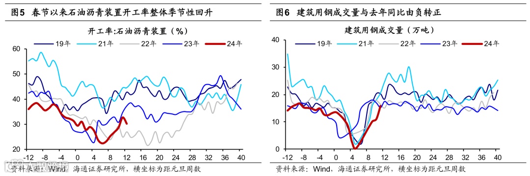 基建:年后基建持续走强,开工施工数据不断改善。分具体施工指标来看,沥青方面,截至2024/03/24,石油沥青装置开工率达30.2%,春节以后整体季节性回升,当前绝对水平高于2022年同期。此外,其他建材指标也显示基建项目或在加速开工施工,例如截至2024/03/22,水泥出货率回升至45.5%,环比继续改善;建筑用钢成交量回升至15.9万吨,与去年同比由负转正。结合以上分析,一季报建筑建材行业的业绩或可期待。