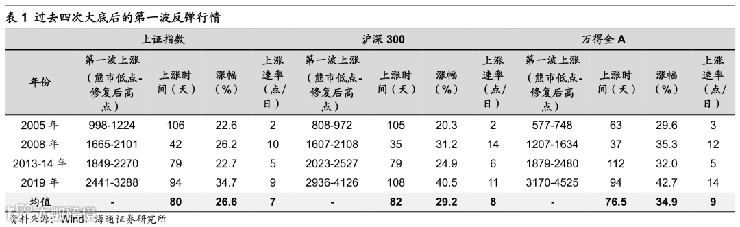 对于后市行情的持续性,我们认为或可借鉴历史底部第一波反弹:回顾过去四次大盘筑底的第一波反弹行情,行情往往持续2—3个月左右、指数涨幅25%—30%左右。本轮行情目前持续约1.5个月,上证综指自低点最大涨幅为17%,沪深300为16%,万得全A为25%,对比历史来看本轮行情或尚未结束。但我们认为,对照历史本轮行情上涨速率明显较快,市场也积累了一定的获利盘压力,接下来也应注意,短期市场上涨节奏或有放缓。