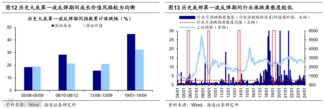 短期行业补涨轮涨或仍将持续。回顾历史,结构层面上,由于底部第一波反弹期间驱动市场上涨的动力往往是情绪修复,因此期间往往呈现各行业普涨、轮涨的特征,同时成长价值风格也较均衡。以国证成长和国证价值指数来衡量,2005/06—2005/09期间成长/价值累计涨18%/19%,2008/10—2008/12期间涨28%/21%,2013/06—2013/09期间涨16%/21%,2019/01—2019/04期间涨45%/32%,即成长和价值的走势并未明显分化。我们进一步比较历次市场大底后第一波反弹期间行业涨跌幅离散度(以行业月涨跌幅标准差/均值绝对值计算),可以发现2005、2008、2013—2014、2019年第一波反弹期间申万一级行业月涨跌幅离散度分别为2.4、0.9、1.0、1.7,均低于2002年以来2.6的均值,可见大底后第一波反弹期内行业涨幅较为均衡,因此参考历史经验,短期应关注前期滞涨行业的补涨机会。