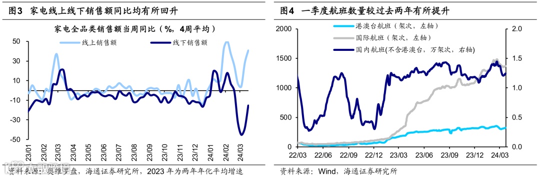 消费:线上家电销量超去年同期,服务消费也在改善。家电消费方面,家电线上与线下销售额的四周平均同比增速持续改善,截至2024/03/17,分别为40.9%、-15.4%,其中一季度家电线上销售情况明显优于去年,因此可以关注家电行业一季报的表现。服务消费也在边际改善,出行消费方面,一季度国内、国际航班数较过去两年明显上升,显示出行需求回暖;餐饮消费方面,1—2月社零餐饮收入增速为12.5%,已恢复至2019年之前的水平,因此一季报或可关注社服、交运等行业。