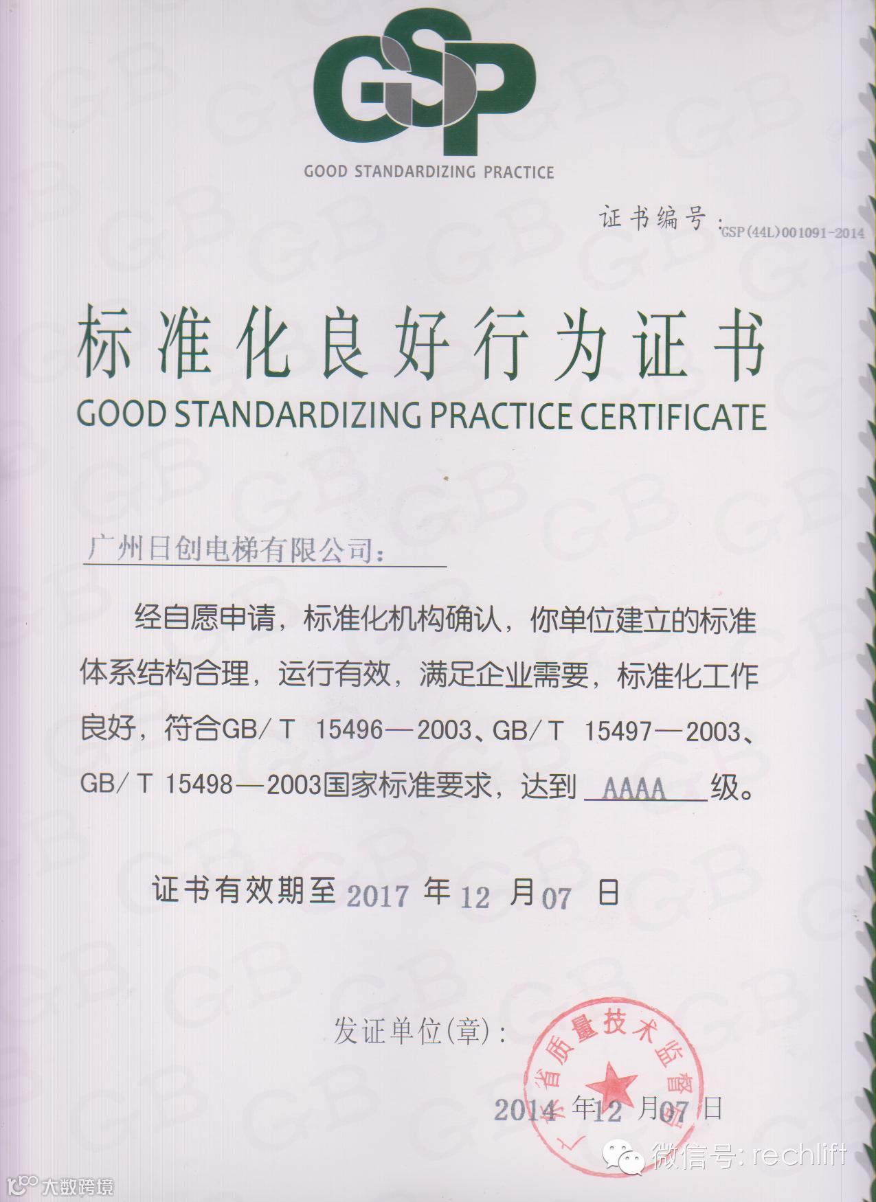电梯从2013年8月份开始按照《企业标准体系》系列国家标准创建标准化良好行为企业,2014年9月以460分通过了广州市质监局组织的“标准化良好行为企业”确认评审,评审组专家一致认为广州日创电梯有限公司创建“标准化良好行为企业”,工作扎实,标准化文件夹齐全,确认级别为AAAA。