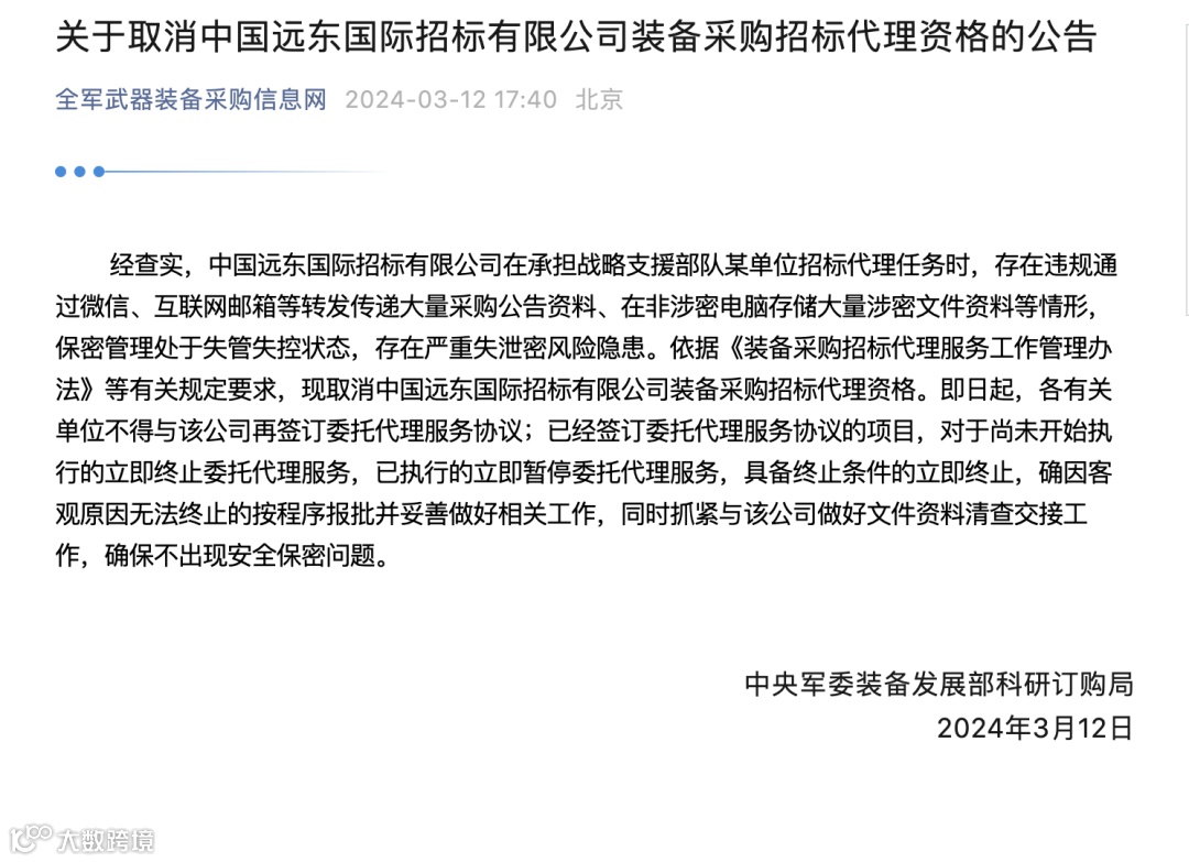 3月12日,中央军委装备发展部科研订购局发布公告称,“由于存在严重失泄密风险隐患”,取消中国远东国际招标有限公司装备采购招标代理资格。全文如下: