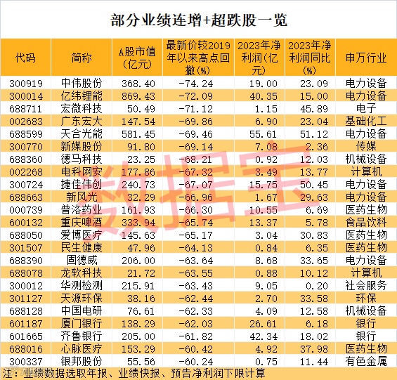 多只业绩连增股处于超跌状态。数据宝统计,最新收盘价与2019年以来高点相比,54股回撤幅度超50%。中伟股份、亿纬锂能、宏微科技回撤幅度排在前三位,这3只股票分别属于锂电池、功率半导体行业。