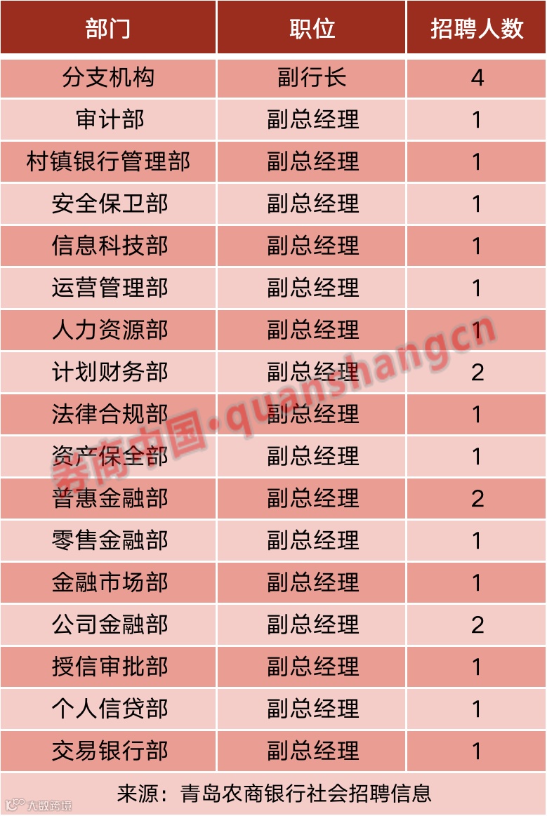 “因业务发展需要,青岛农商银行现面向社会公开招聘,诚邀业内有识之士和具有出色管理能力的优秀人才加盟。”——青岛农商银行发布的招聘信息显示。
