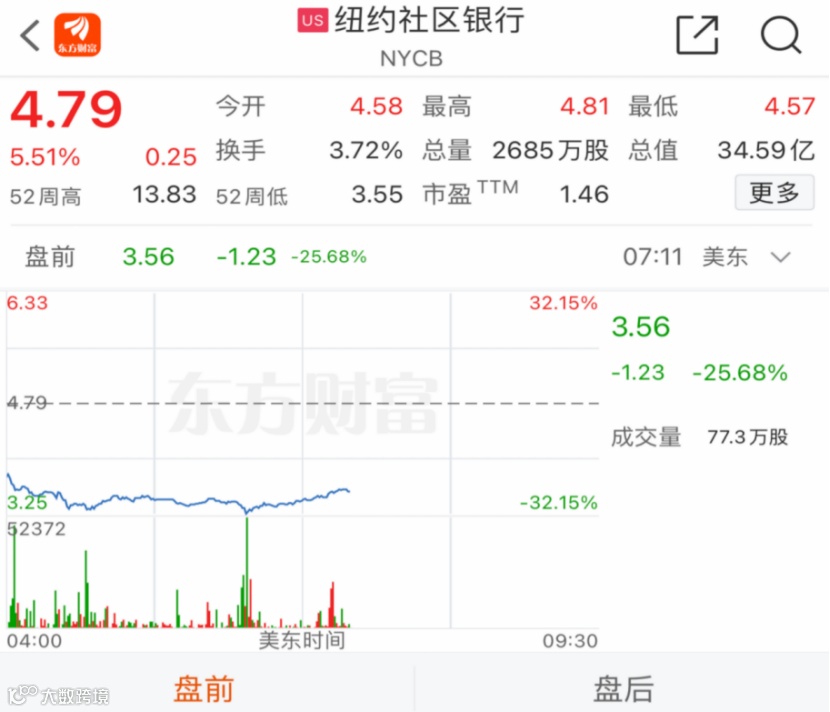 3月1日美股盘前,纽约社区银行股价突然暴跌,最大跌幅一度超32%。