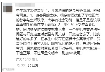 一名网友在视频下方发了一张身穿绿衣的照片,自称是当事人,并且是学生。其留言称,因梅园附近堵车,一辆奥迪车在路中间多次按喇叭,自己确认司机不是老师而是游客,遂上前质问。其间,司机儿子朝其“吐唾沫”,并称“大学生怎么这么没素质”“我开奥迪过得比你好”。双方随后爆发了肢体冲突,最后被保安拦了下来。