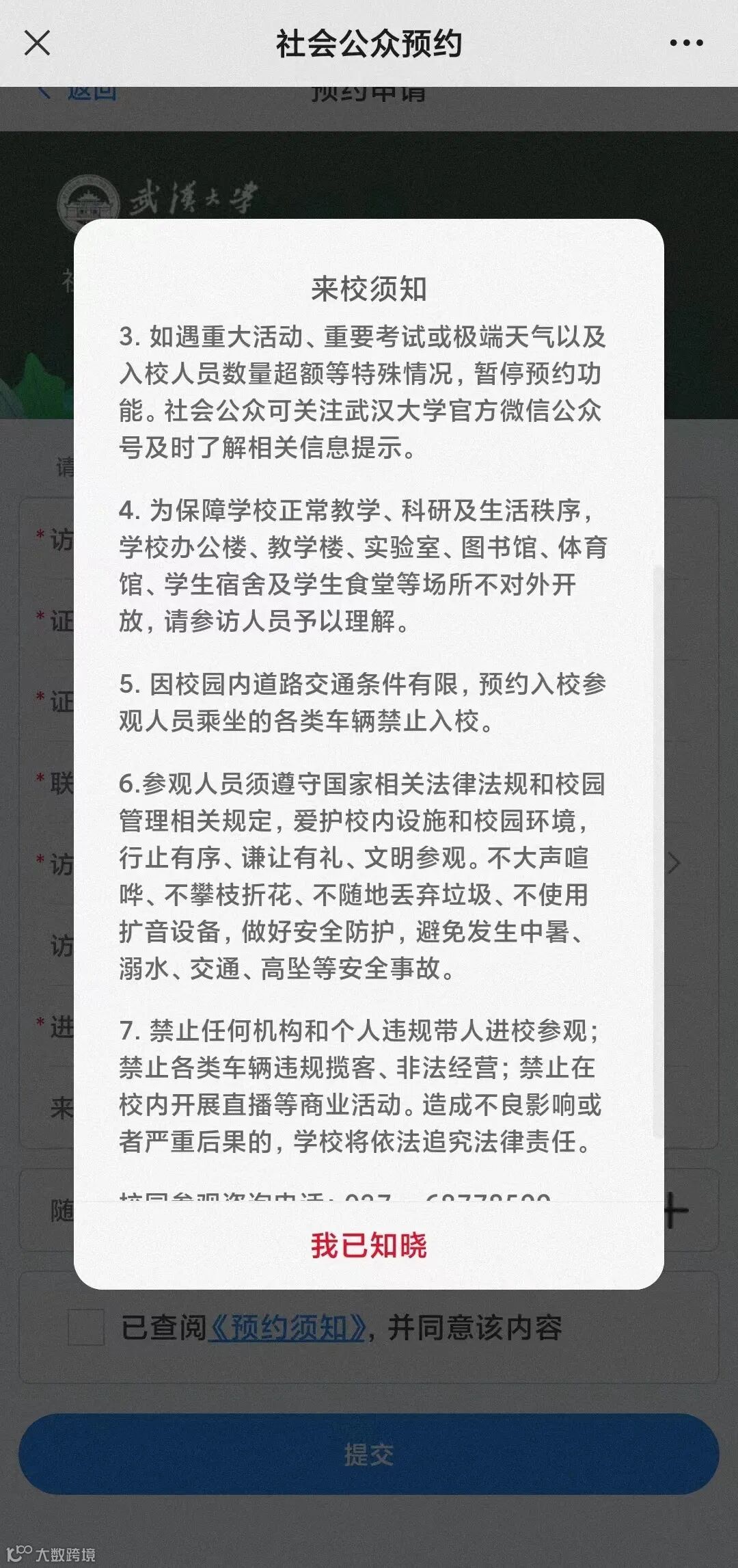 武汉大学社会公众预约通道的“来校须知”第5条明确规定:“因校园内道路交通条件有限,预约入校参观人员乘坐的各类车辆禁止入校。”