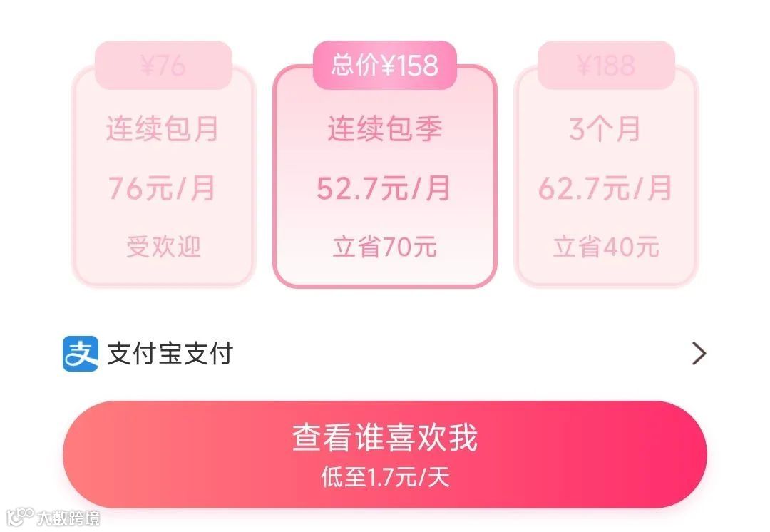 而当用户想进一步了解这些喜欢自己的人是谁时,就要进入下一步“充值阶段”:该平台为“查看谁喜欢我和访客”功能设置了VIP充值包,连续包月76元/月,连续包季52.7元/月。