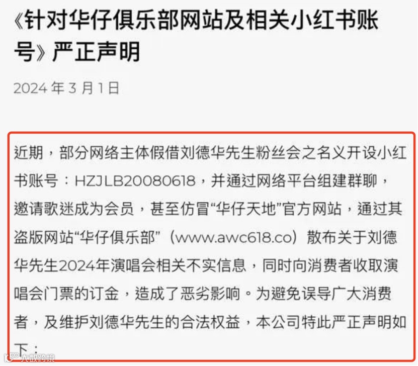 严正声明中提到,近期,部分网络主体假借刘德华先生粉丝会之名义开设小红书账号:HZJLB20080618,并通过网络平台组建群聊,邀请歌迷成为会员,甚至仿冒“华仔天地”官方网站,通过其盗版网站“华仔俱乐部”(www.awc618.co)散布关于刘德华先生2024年演唱会相关不实信息,同时向消费者收取演唱会门票的订金,造成了恶劣影响。