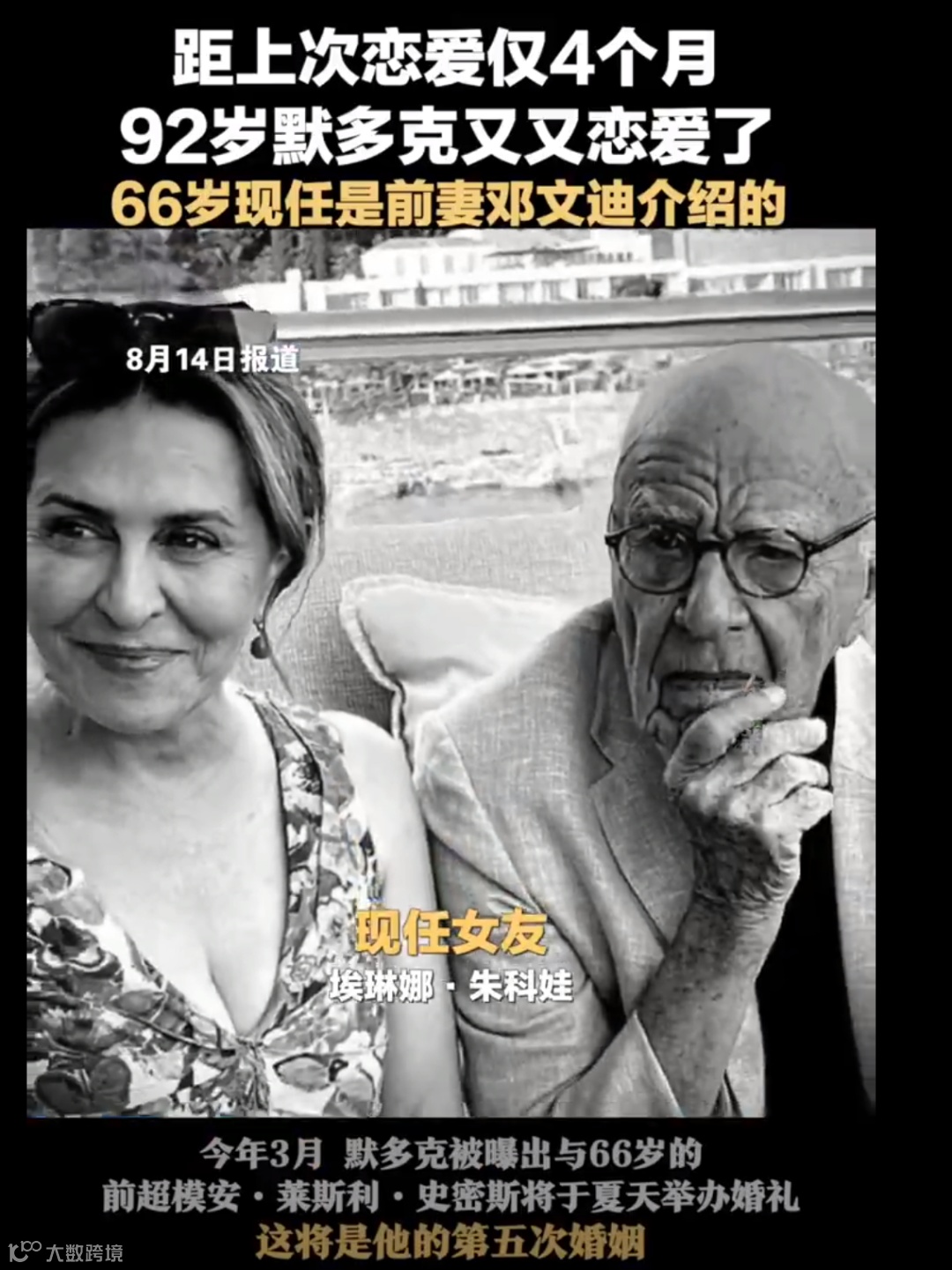 而现年92岁的默多克已经有过4段婚姻,并有6个孩子。据悉,其第一任妻子澳大利亚人帕特里夏·布克,两人结婚9年后,于1965年离婚。第二任妻子是安娜·托夫,两人结婚32年,于1999年离婚。第三任妻子是邓文迪,这段婚姻持续了14年,两人于2013年离婚。第四任妻子,系小默多克25岁的名模杰丽·霍尔,两人最终也以离婚结束。去年早些时候,默多克在接受采访时宣布已经与电台主持人安·莱斯利·史密斯订婚并准备结婚。不过不久之后,默多克便取消了婚约。