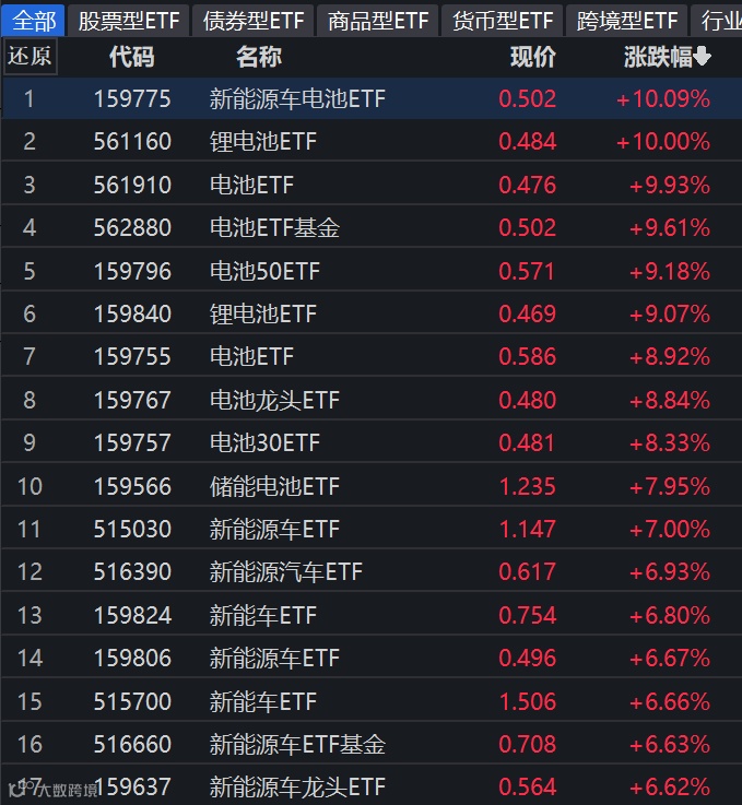 和ETF基金成为持有宁德时代主力相对应,11日新能源主题ETF霸屏全市场。数据显示,截至11日收盘,全市场涨幅超过6%的21只ETF均为新能源主题产品。其中,建信基金旗下的新能源车电池ETF和富国基金旗下的锂电池ETF双双涨停,招商基金、嘉实基金、汇添富基金、工银瑞信基金等旗下约7只电池相关ETF涨幅超过了8%。