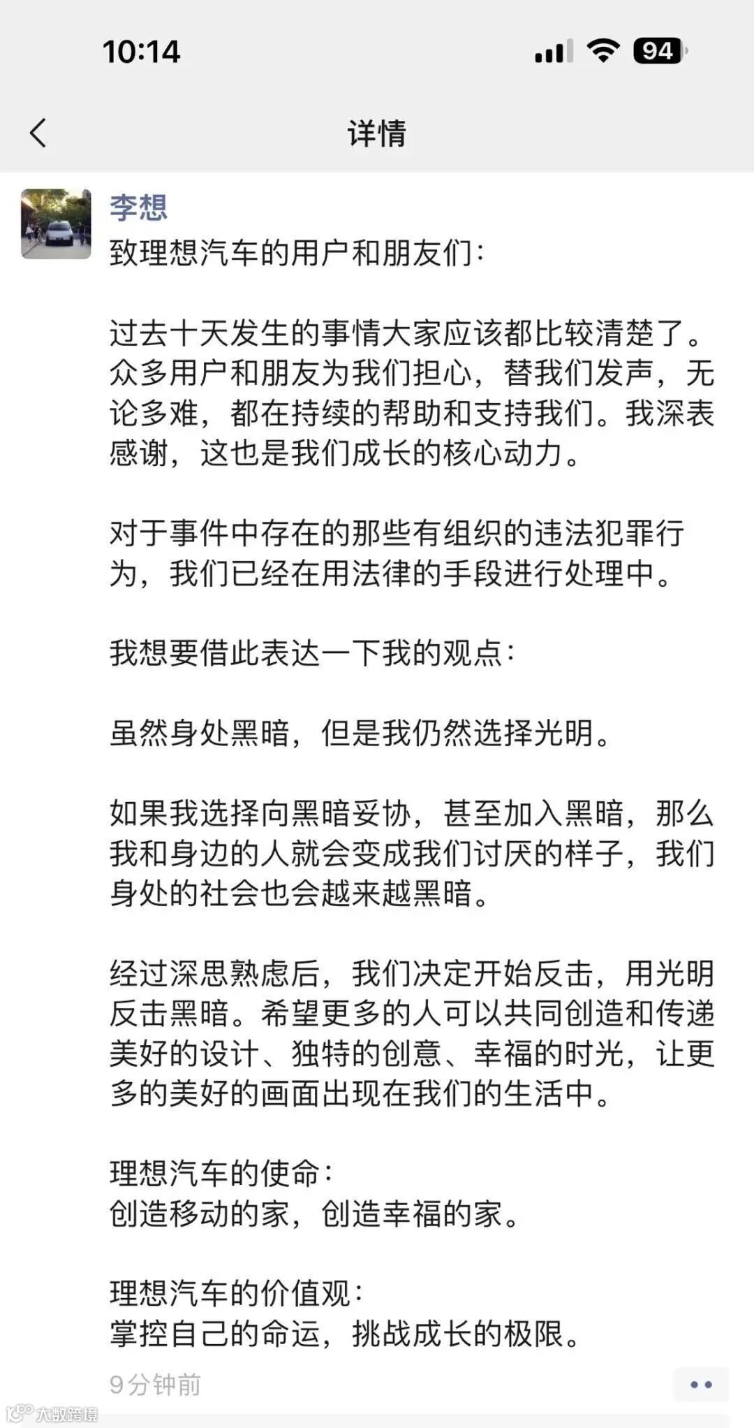 此外,李想还称,“虽然身处黑暗,但是我仍然选择光明。如果我选择向黑暗妥协,甚至加入黑暗,那么我和身边的人就会变成我们讨厌的样子,我们身处的社会也会越来越黑暗。经过深思熟虑后,我们决定开始反击,用光明反击黑暗。希望更多的人可以共同创造和传递美好的设计、独特的创意、幸福的时光,让更多的美好的画面出现在我们的生活中。”