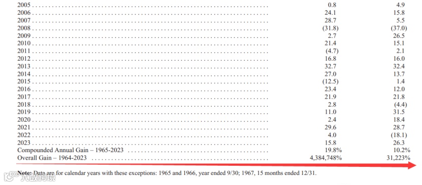今年的股东信,巴菲特没有依照惯例,在信的开头提供伯克希尔·哈撒韦的业绩与美股风向标标普500指数表现的对比,而是放在了最后。2023年,伯克希尔·哈撒韦每股市值的增幅为15.8%,标普500指数为增长26.3个百分点。长期来看,在1965—2023年,伯克希尔·哈撒韦每股市值的复合年增长率为19.8%,明显超过标普500指数的10.2%,而1964—2023年伯克希尔·哈撒韦的市值增长率是令人吃惊的4384748%,也就是43847倍多,而标普500指数为31223%,即超过312倍。