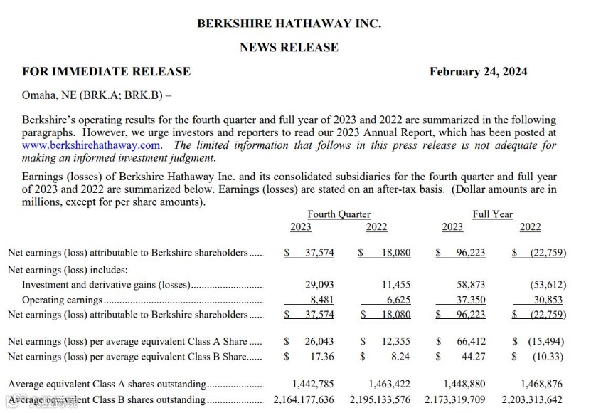 北京时间2月24日晚间,巴菲特又一次吸引了全球投资者的目光。北京时间当晚9点,巴菲特旗下公司伯克希尔·哈撒韦发布2023年四季度及全年财报。同时,巴菲特致股东信也对外公布,这也是93岁的巴菲特人生中第46封股东信。