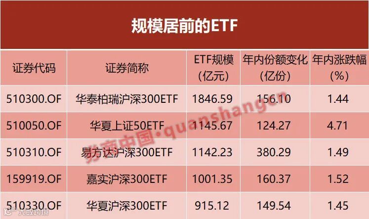 继去年8月份华泰柏瑞沪深300ETF首次达到千亿规模后,当前非货ETF“千亿俱乐部”已有四名成员,且还有华夏沪深300ETF等产品向这一目标迈进。在震荡市中敢于踊跃加仓的部分资金或已获利——当前规模排名前五的非货ETF年内全部获得了正收益,涨幅基本约为1.4%左右,其中华夏上证50ETF更是以4.7%的涨幅领跑。