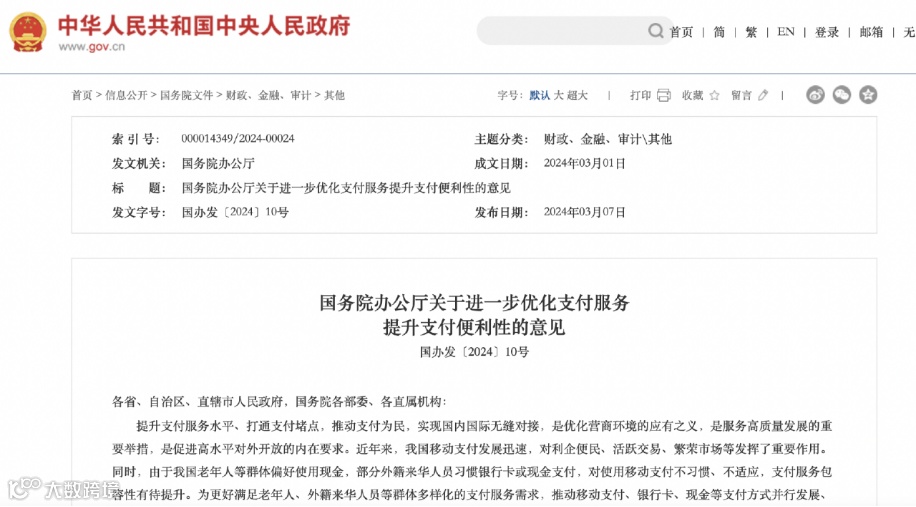 3月7日,国务院发布《关于进一步优化支付服务提升支付便利性的意见》,指导支付服务主体不断提升老年人、外籍来华人员等群体的支付服务便捷性和满意度。