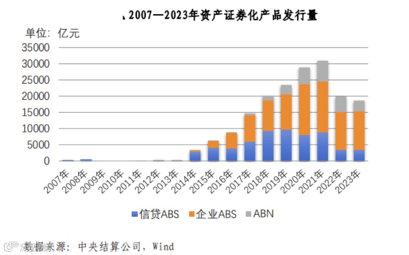 回顾往年,我国资产证券化业务发行规模曾保持多年增长,2021年达到峰值的3.1万亿元之后,2022年和2023年连续两年下滑。