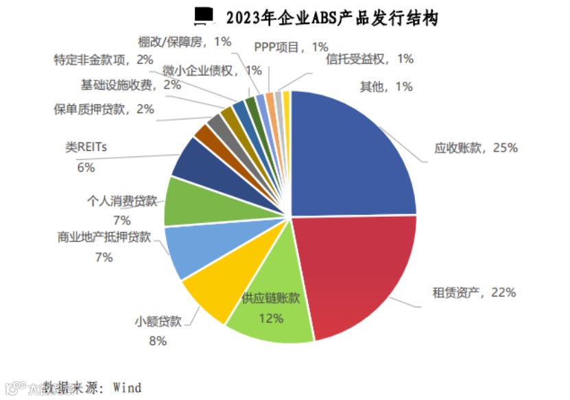 企业ABS中,应收账款ABS和租赁资产ABS为发行规模最大的两个品种,发行量分别为2913.60亿元和2614.87亿元,占比分别为25%和22%。