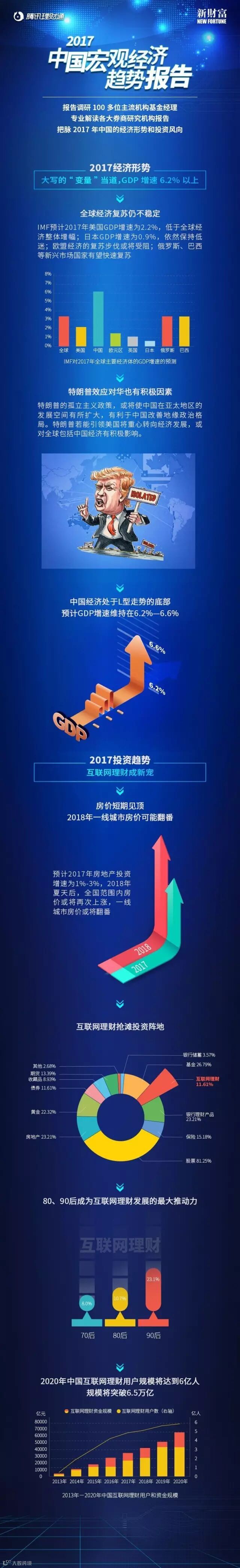 在全球动荡的格局下,2017年全球经济会走向何方?房价是否仍然居高不下?股票市场还存在哪些投资机会?个人投资方向又该如何抉择?腾讯理财通联合新财富重磅发布《2017年中国宏观经济趋势报告》,一图帮你解析2017年宏观经济形势。
