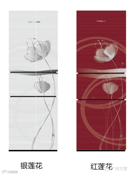 万宝冰箱 BCD-212 SCJ 为三开门,玻璃钢面板冰箱。颜色有银色和红色,花色为大气的双荷花设计,画面整体结构简洁、美观给人一种包含中国水墨风清的现代艺术美。