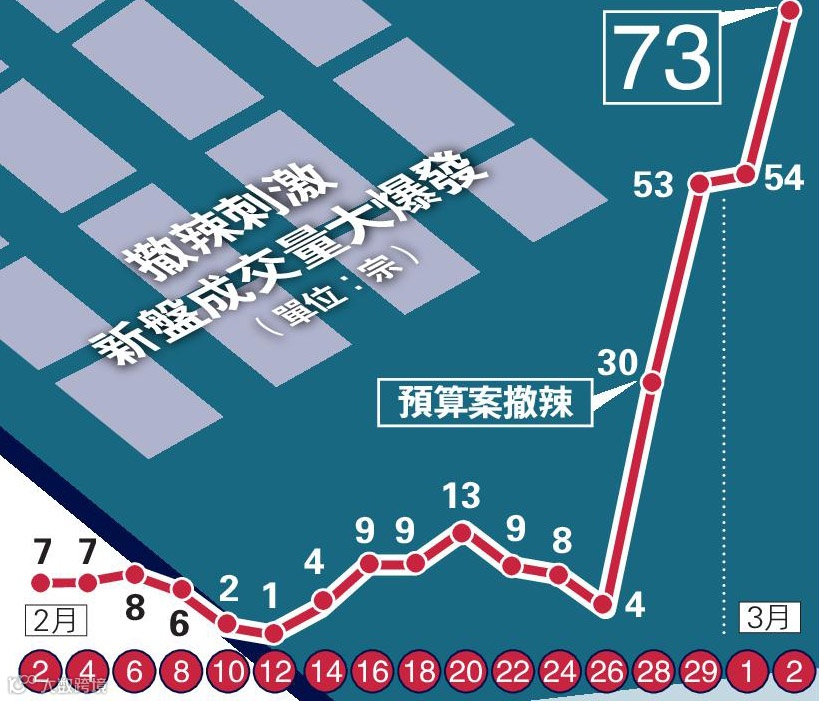 3月3日,据香港大公文汇网报道,综合市场消息及一手成交纪录册,“撤辣”后4天一手住宅市场录得210宗成交,超越2月前27天的逾190宗水平,3月2日成交已连续第三日超过50宗,达到73宗,按周升7倍。