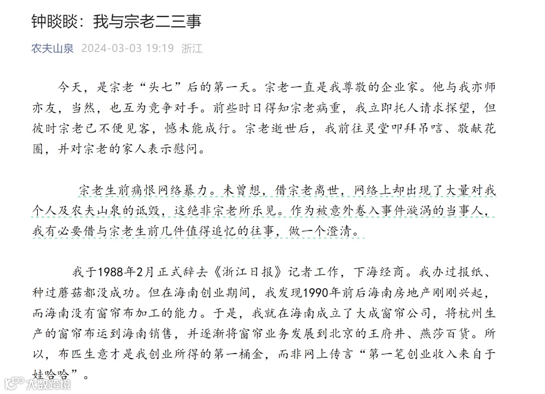 今日,农夫山泉官微发布“钟睒睒:我与宗老二三事”一文,其中,钟睒睒“借与宗老生前几件值得追忆的往事”,澄清近期网络上出现的大量对其个人及农夫山泉的传闻。
