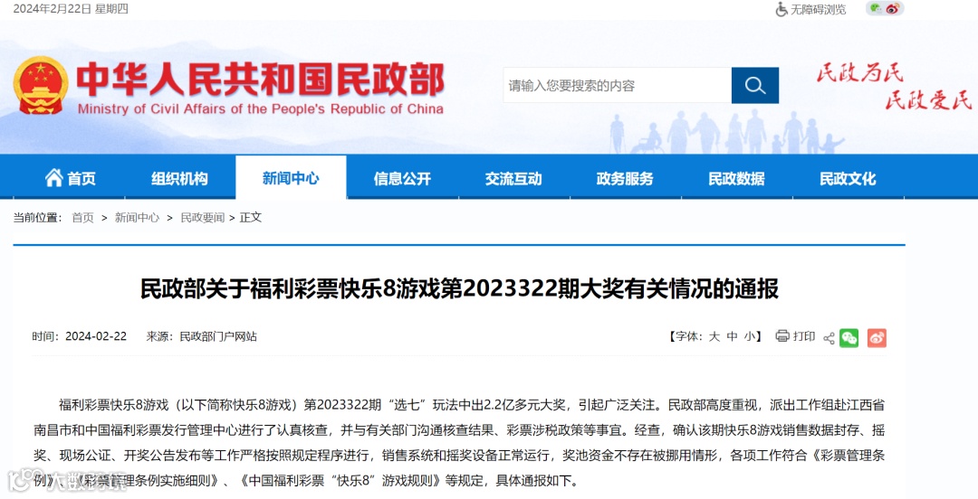 民政部关于福利彩票快乐8游戏第2023322期大奖有关情况的通报