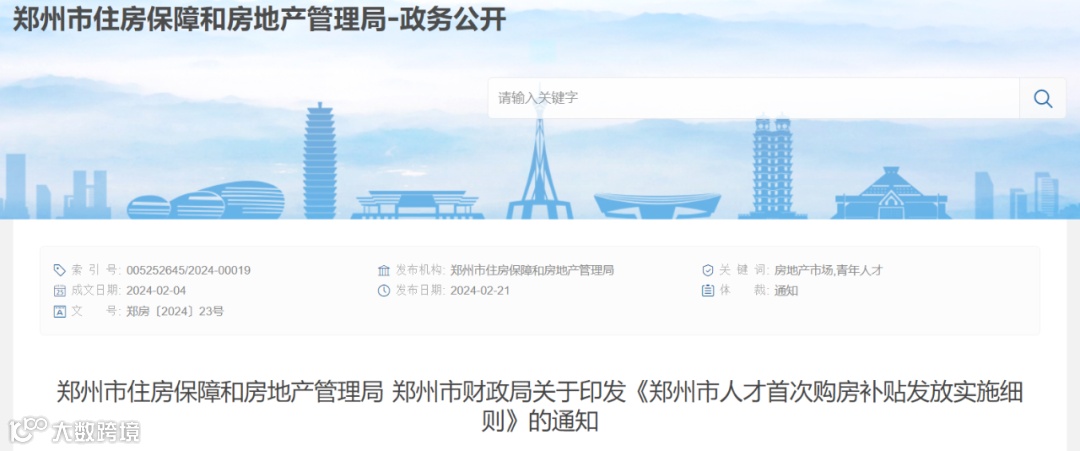 2月21日,郑州市住房保障和房地产管理局、郑州市财政局联合发布《郑州市人才首次购房补贴发放实施细则》。