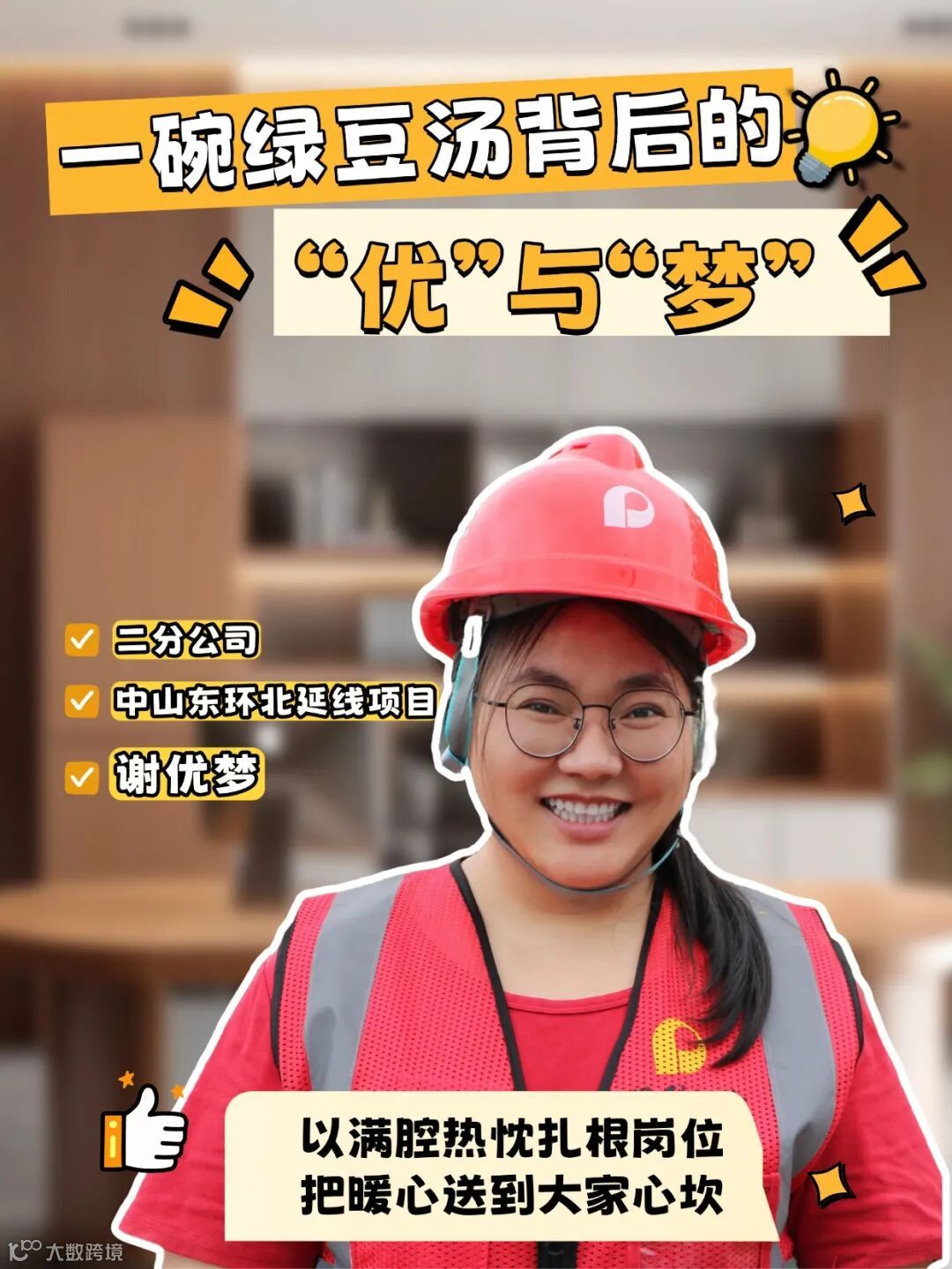 正是在她这种“风风火火抓落实、细致周到管到底”的过硬作风下,中山东环北延线项目的工人驻地始终整洁有序、安全规范。有人说,综合部的工作是“上面千条线,下面一根针”,既要对接上级的各项要求,又要服务好项目上的每一位员工;既要抓实大事要事,又不能忽略细碎琐事。没有十足的耐心干不了,没有强烈的责任心干不好,而谢优梦恰恰是那个既有“风风火火的执行力”,又有“细致周全的考量力”的得力干将。