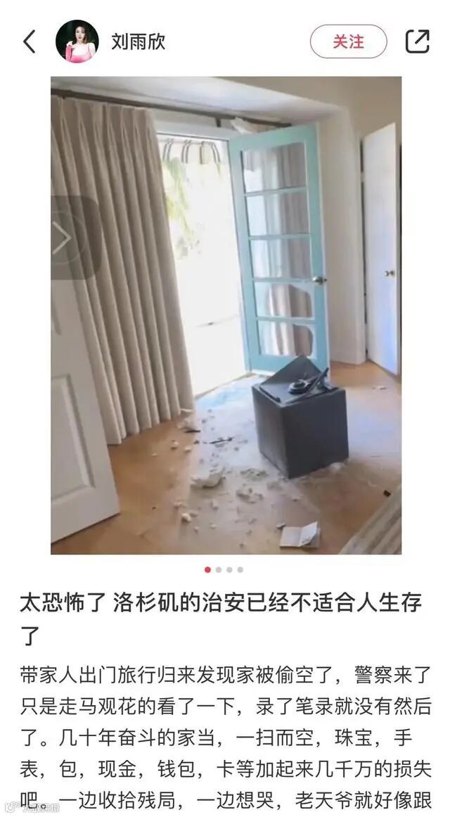19日凌晨,刘雨欣曾在微信朋友圈发文写道:“洛杉矶的治安已经不适合人居住了,真的想搬离这里。”