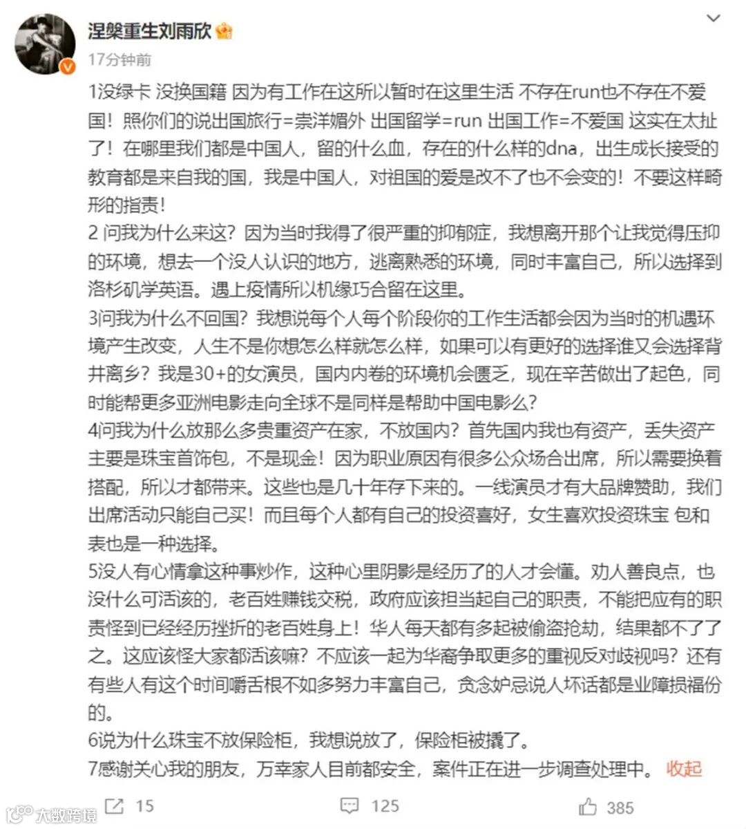 刘雨欣还表示,此次丢失的资产主要是珠宝首饰包,由于职业原因要出席很多公众场合,需要换着搭配,所以才都带去洛杉矶。这些也是她几十年存下来的,珠宝放在保险柜被撬了。“万幸家人目前都安全,案件正在进一步调查处理中。”