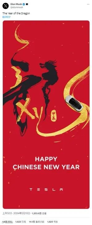 2月10日,特斯拉CEO伊隆·马斯克(@ElonMusk )发布贺年微博:“龙年大吉”,并配有一张特斯拉的海报,上有“Happy Chinese New Year”字样。