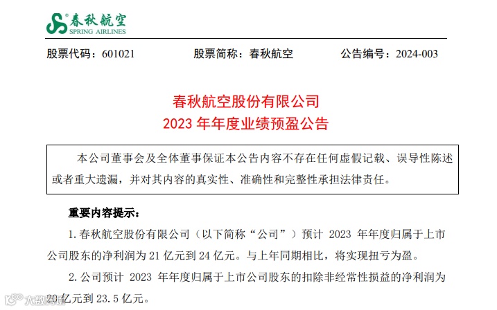 民营航司龙头春秋航空预计,2023年归母净利润为21亿元到24亿元,即使扣除非经常性损益,该公司扣非后净利润仍将高达20亿元至23.5亿元区间。