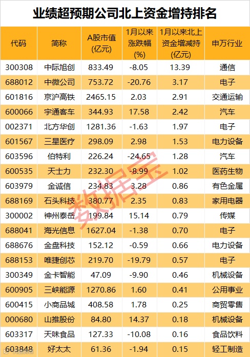 数据宝统计,1月以来,按照区间成交均价计算,北上资金增持超亿元的有8家,分别有中际旭创、中微公司、京沪高铁、宇通客车、北方华创等。