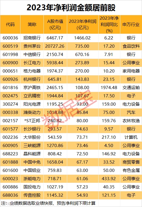 招商银行业绩快报显示,公司2023年净利润为1466.02亿元,创下历史新高;该盈利金额暂居A股第一位。贵州茅台预计2023年净利润约735亿元,同比增长约17.2%,净利润同样创下历史新高。