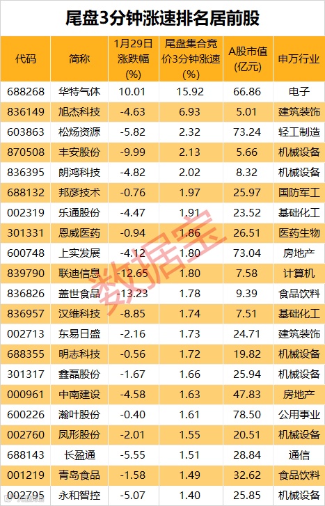 临近收盘时,A股部分股票出现大幅拉升。证券时报·数据宝统计,尾盘集合竞价3分钟内,35股涨速超过1%,包括华特气体、旭杰科技、松炀资源、丰安股份、朗鸿科技等,这些股票超六成A股市值不足50亿元。