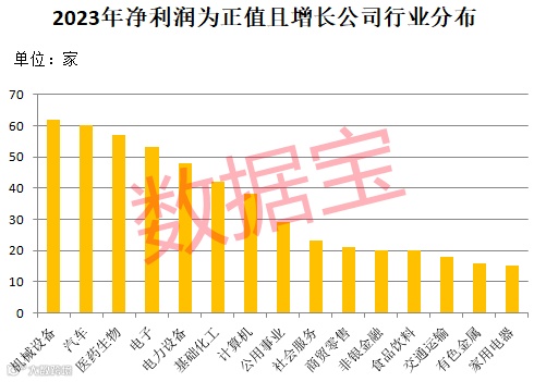证券时报·数据宝统计,截至目前,按照2023年年报、业绩快报、预告净利润下限计算,合计652家公司2023年净利润为增长状态,占已披露公司总数的59.71%。机械设备、汽车、医药生物、电子、电力设备行业入围公司数量排在前五位。